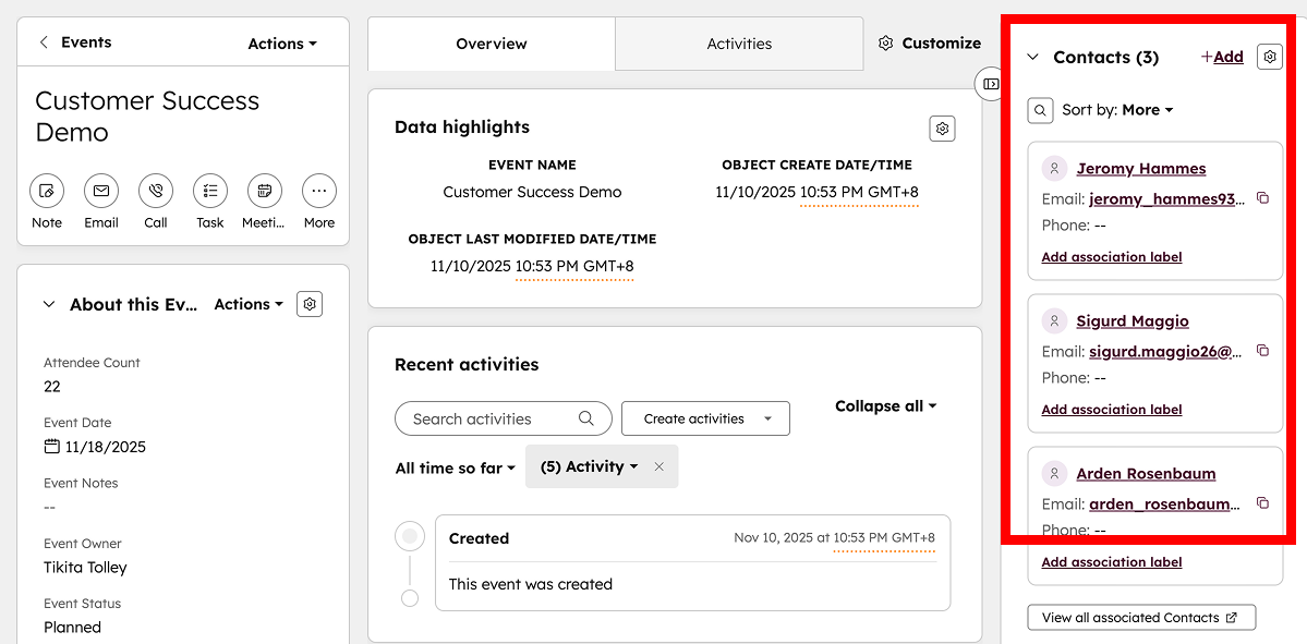 - Add Associations Manually (Quick Fix) From any record (like a Contact or Deal), click Actions → Associate, then select your custom object. This immediately links the two records so workflows and reports can recognize their relationship.