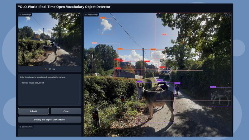 I uploaded an image and specified just a few object classes: donkey, house, tree, and cloud. Instantly, YOLO-World scanned the image and accurately detected every single one.