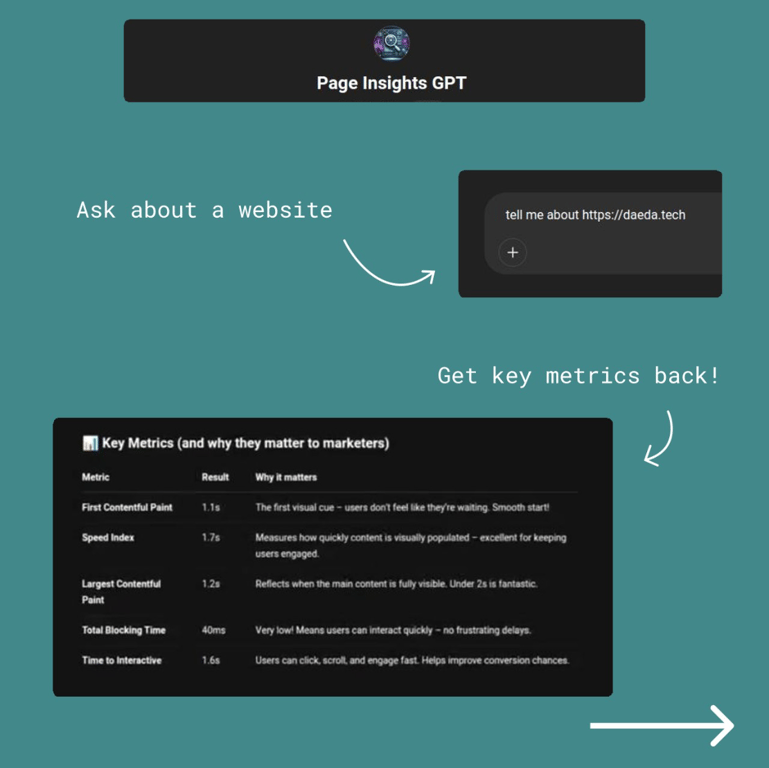 At Daeda, we build tools that make tech feel less overwhelming and more intuitive. Page Insights GPT started as a helper for our own work - something to speed up reviewing sites and understanding messaging at a glance.