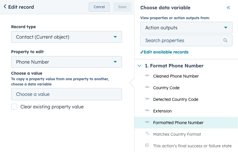 Tip: Clean Dial formats and validates your number, but it won’t overwrite anything on its own. To save the result, follow it with a “Edit record” under CRM actions, targeting the phone field you want to update.