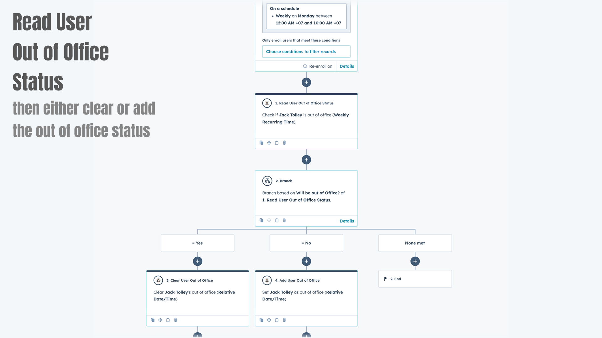 Add Action: sets a HubSpot user as out of office for a specified time period: